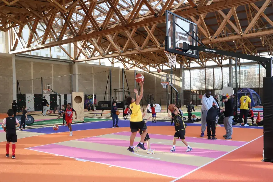 • Le basket-ball, avec une aire modulable permettant d’installer soit un terrain 5×5, soit deux terrains 3×3 homologués pour les compétitions nationales et internationales. Cet aménagement flexible permet d’accueillir aussi bien des séances libres que des événements sportifs d’envergure.