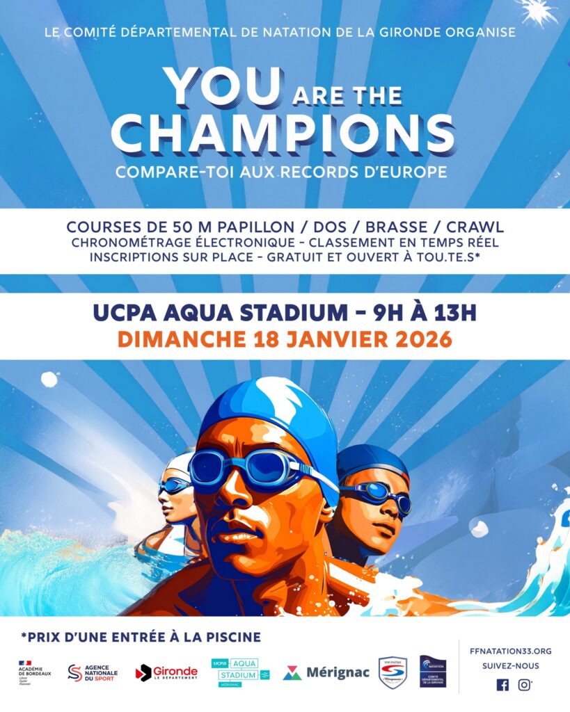 Pour la première fois en Gironde, les nageurs amateurs vont pouvoir se mesurer, chronomètre à l’appui, aux plus grands champions de la natation. Ce dimanche matin, l’UCPA Aqua Stadium de Mérignac accueille « You Are the Champions », un événement inédit imaginé pour rapprocher le grand public de la natation de haut niveau, dans une ambiance conviviale et accessible à tous.