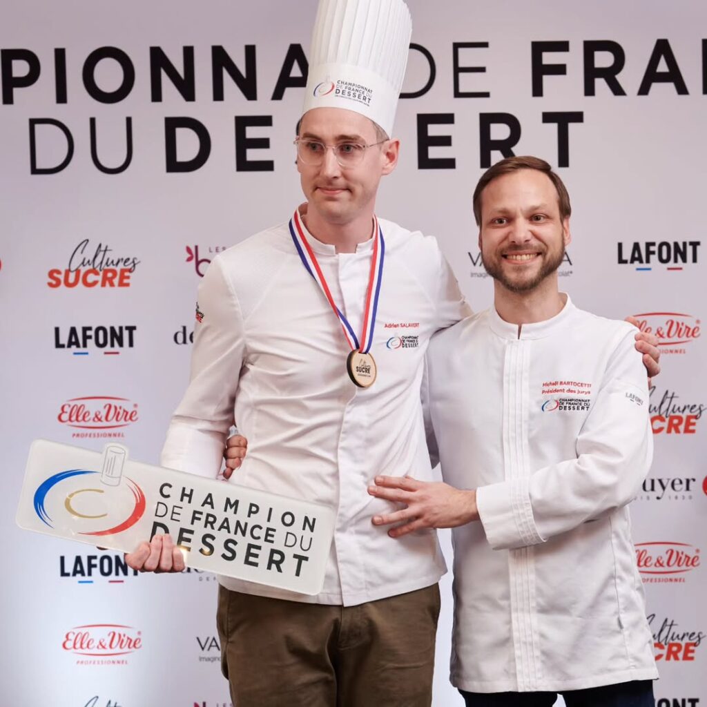 Après avoir remporté la sélection régionale en début d’année, Adrien Salavert représentait la zone Centre Ouest. Il a su se démarquer dans un format de compétition intense : les candidats disposaient de seulement 4h30 pour réaliser deux desserts, dont un imaginé à partir d’un panier surprise découvert sur place.