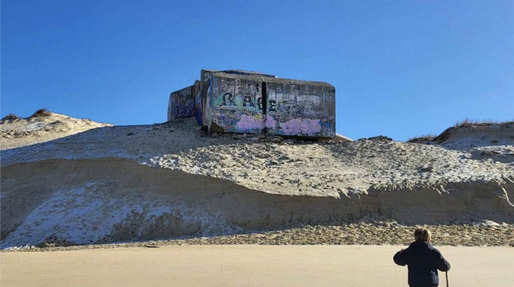 Ces blockhaus, vestiges du mur de l’Atlantique édifié par l’armée allemande pendant l’Occupation, ponctuent encore de nombreuses plages de la façade atlantique. À Lège-Cap-Ferret, ils sont devenus malgré eux des marqueurs visibles de l’érosion côtière. Certains ont déjà disparu sous les eaux du bassin d’Arcachon, immergés parfois à plus de quinze mètres de profondeur. Celui de la plage de l’Horizon n’est donc ni le premier, ni sans doute le dernier à basculer.
