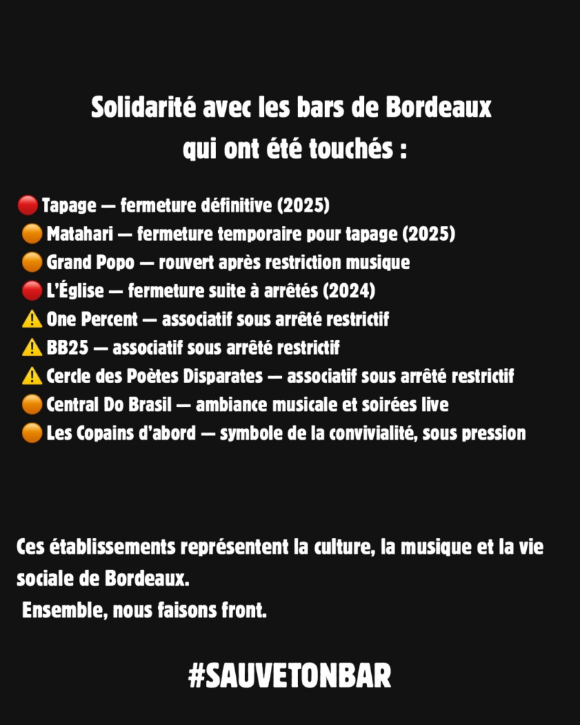 Si tu aimes sortir à Bordeaux, tu as sûrement remarqué leurs publications sur fond noir : « Sauve ton bar ». Ce vendredi 20 mars, 25 bars de la ville ont choisi de faire front commun sur les réseaux sociaux pour alerter sur l’importance de la vie nocturne et culturelle. Leur message est clair : chaque fermeture fragilise la ville, les artistes, les équipes et les habitants.