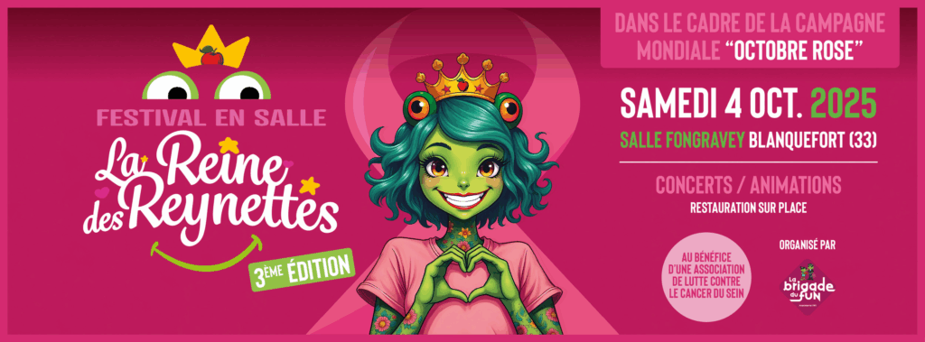 À Blanquefort, la salle Fongravey accueille le festival “La Reine des Reynettes” le 11 octobre, de 18 h à minuit, au profit de l’association Rose Médoc. À l’affiche : Sugar & Tiger avec Didier Wampas, Menni Jab, AKM, Kink Kong Blues, Vincent Jouffroy, Cyntia et Mad Bronco. L’intégralité des recettes des billets (10 € en prévente, 12 € sur place, gratuit pour les moins de 12 ans) sera reversée à la lutte contre le cancer du sein.