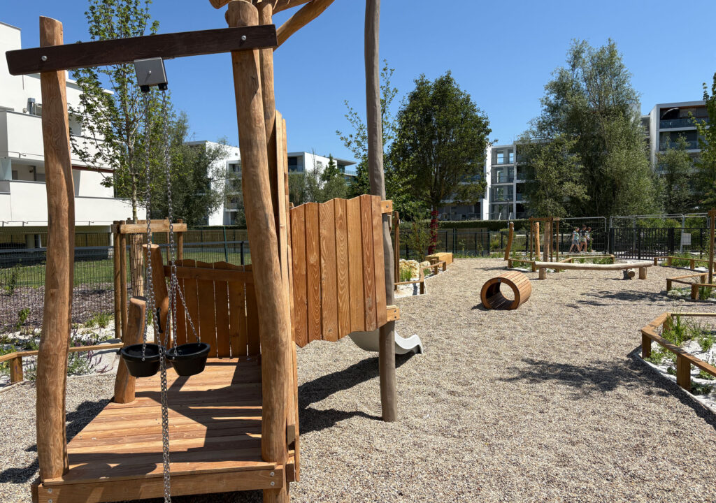 La rénovation a permis de planter de nombreux arbres, réduisant les effets des îlots de chaleur l’été et rendant la place plus accueillante. Le taux de végétalisation dépasse désormais 60 %, et de nouveaux équipements ont été installés pour tous les publics : aires de jeux ombragées pour les enfants, terrain de pétanque, tables de pique-nique sous une ombrière, et cheminements adaptés aux piétons et cyclistes. Même la station de relevage a été habillée de bois pour mieux s’intégrer au paysage.
