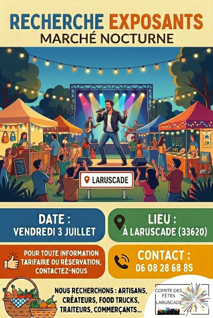 Après plus d’une décennie sans édition, le marché nocturne de Laruscade s’apprête à renaître. Porté par le Comité des Fêtes de Laruscade, cet événement emblématique fera son retour le vendredi 3 juillet, avec l’ambition de rassembler habitants et visiteurs autour d’un moment convivial et festif.