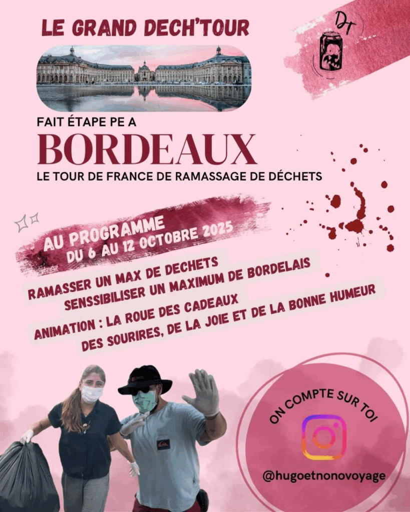 Le Grand Déch’Tour n’est pas seulement un projet écologique : c’est une aventure citoyenne, fun et inspirante. Alors si tu veux voir ton action faire la différence et inspirer les autres, note bien la date : du 6 au 12 octobre à Bordeaux, Hugo et Nono t’attendent pour ramasser, sensibiliser et transformer la ville. Rejoins le mouvement, partage ton énergie et deviens acteur du changement !