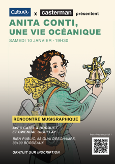 Cette soirée s’inspire de la bande dessinée Anita Conti, publiée chez Casterman et signée Catel & Bocquet, duo reconnu pour son travail sur les grandes femmes oubliées de l’histoire. À travers 14 dessins projetés et commentés, les auteurs retracent le parcours hors norme de cette scientifique libre et engagée. Le récit est enrichi par des images d’archives filmées par Anita Conti elle-même, offrant un regard rare et intime sur son travail. La dimension émotionnelle est renforcée par une création musicale en direct au piano, interprétée par Gwendal Giguelay.