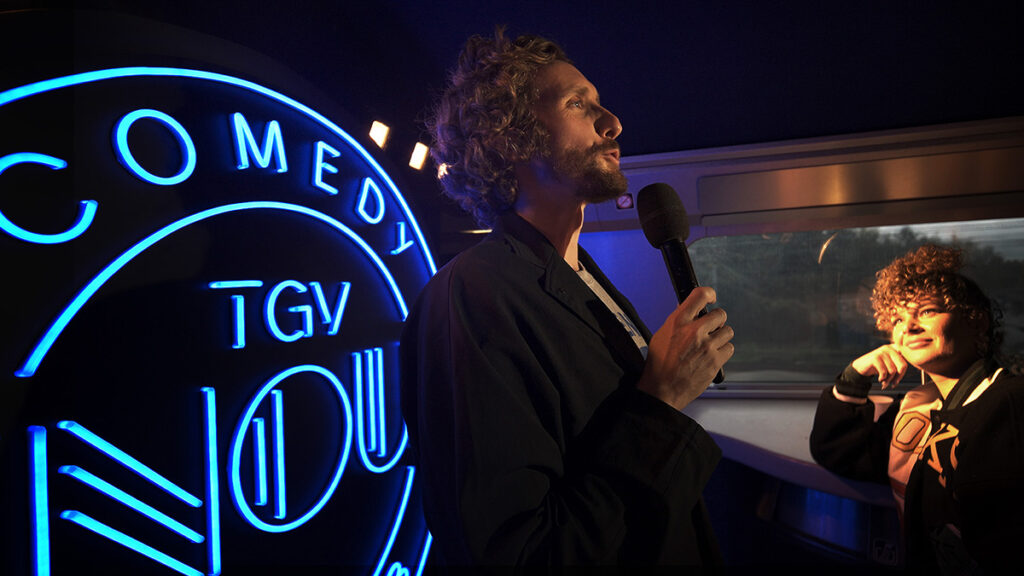 Exit les sandwichs et les bouteilles d’eau : la voiture-bar du TGV s’est métamorphosée en salle de spectacle itinérante. Projecteurs, néons, micro sur pied, petite scène… Tout y est pour créer une ambiance authentique de comedy club. Et la promesse d’un show insolite se confirme dès les premiers instants avec l’entrée en scène de Sylvain Gautier, qui lance : « Bienvenue dans la tournée la plus rapide de France : on va jouer dans 143 villes en moins d’une heure ! »