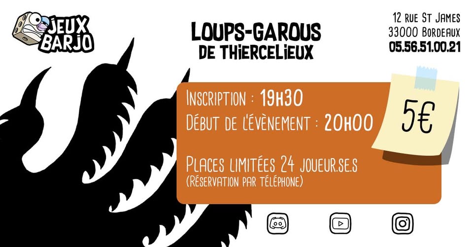 Cette semaine, prépare-toi à aiguiser ton instinct et ton sens de la déduction. Jeux Barjo t’invite à une soirée Loups-Garous où la paranoïa sera reine et où personne ne sera vraiment innocent. Le décor est planté : le bar se réveille, le barman est toujours en vie… trop beau pour être vrai. Et si c’était lui, le Loup-Garou ? À toi de mener l’enquête, de bluffer, d’accuser, ou de survivre jusqu’à l’aube.
