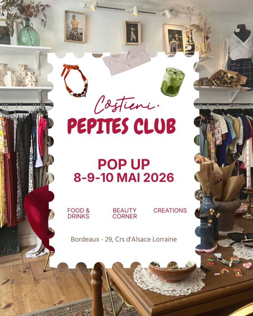 Tu vas pouvoir découvrir Bordeaux autrement avec l’arrivée du Costieni Pépites Club, un pop-up créatif qui s’installe du 8 au 10 mai au 29 cours d’Alsace-Lorraine. Pendant trois jours, tu explores un lieu vivant où mode, food et beauté se rencontrent.