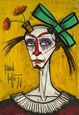 Parmi les lots phares, une huile sur toile Crâne fond marron (1958), estimée entre 60 000 et 80 000 euros, illustre le goût de Buffet pour les sujets sombres et symboliques. Mais la vedette de la vente pourrait bien être un Clown au nœud vert de 1970, estimé entre 200 000 et 300 000 euros. « C’est le thème le plus recherché chez Bernard Buffet », souligne l’experte. Le peintre commença à représenter ces clowns tristes et anguleux dès les années 1950, en faisant de ces figures mélancoliques un emblème de sa sensibilité.