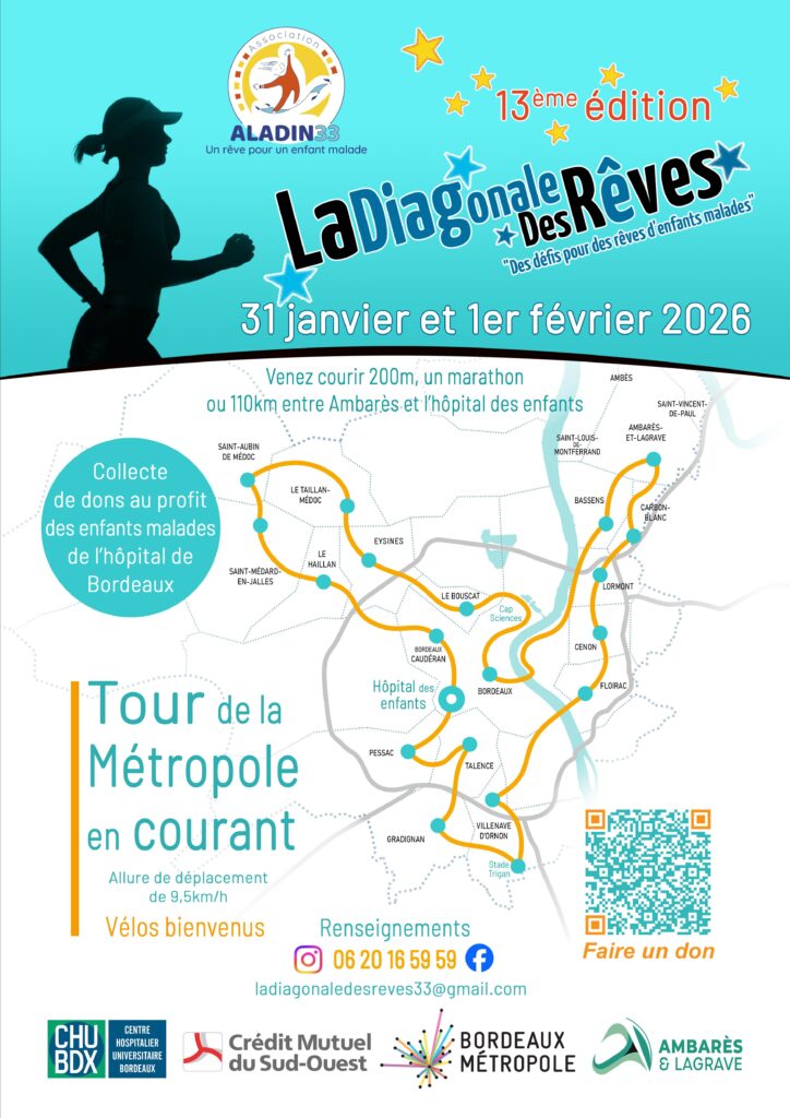 Le samedi 31 janvier, le départ sera donné à 8h30 depuis la mairie d’Ambarès-et-Lagrave, pour une première étape de 60 kilomètres jusqu’à l’Hôpital des Enfants de Bordeaux. L’allure est volontairement accessible, autour de 9,5 km/h, afin de permettre au plus grand nombre de participer. Chacun est libre de rejoindre la course pour la distance de son choix, dans une ambiance conviviale et bienveillante.