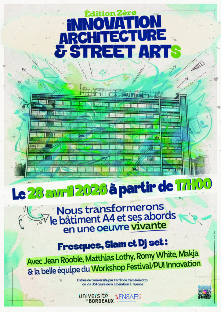 Et si tu venais voir à quoi ressemble l’innovation… quand elle sort des salles de cours et s’affiche en grand sur les murs ? Le 28 avril, l’ENSAP Bordeaux lance l’édition zéro du Festival Innovation, Architecture & Street ArtS — un prologue qui pourrait bien poser les bases d’un futur grand rendez-vous. Depuis janvier, une vingtaine d’étudiants, artistes et chercheurs planchent chaque semaine en workshop pour questionner les imaginaires, bousculer les idées reçues et créer un vrai “marqueur” vivant de l’innovation sur le campus.