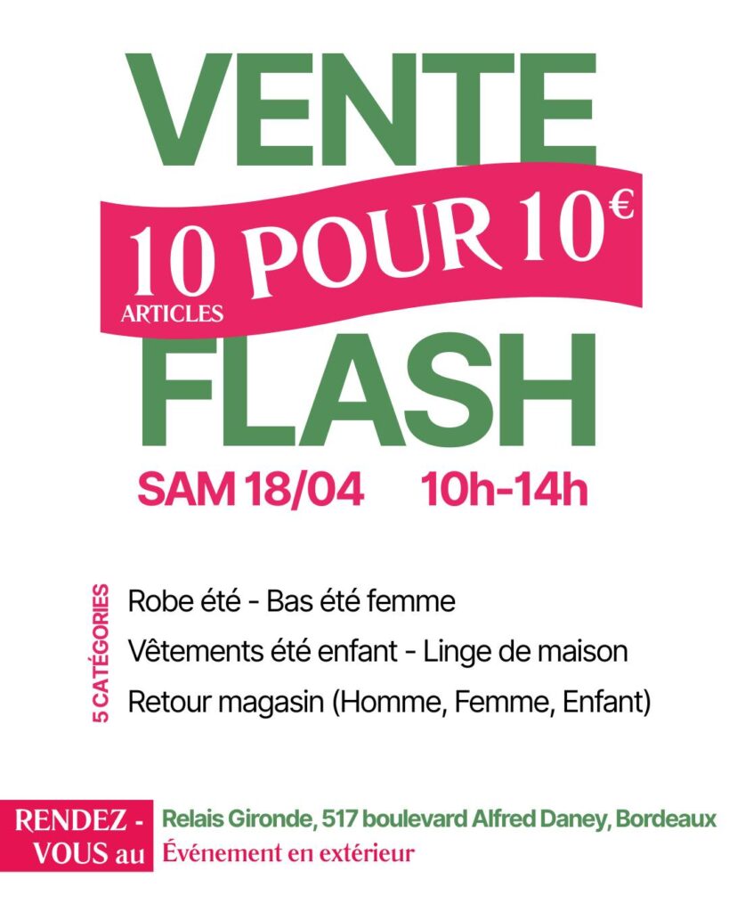 Tu cherches à renouveler ta garde-robe sans exploser ton budget ? Direction le quartier de Bacalan, à Bordeaux, où une vente flash promet d’attirer les chasseurs de bonnes affaires. Le samedi 18 avril 2026, le Relais Gironde organise une opération exceptionnelle : dix vêtements pour seulement dix euros. Une offre rare, qui mêle économies, écologie et solidarité.