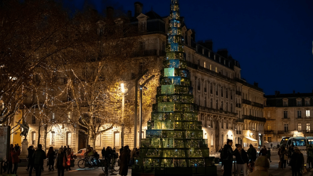 Pour la quatrième année consécutive, le Sapin Verre d’Arnaud Lapierre trône sur la place Pey-Berland, illuminé du 6 décembre 2025 au 4 janvier 2026. Conçu localement avec du verre et de l’acier recyclés, il brille chaque jour de 7h à 10h et de 16h30 à minuit, offrant un décor unique pour tes photos de Noël.
