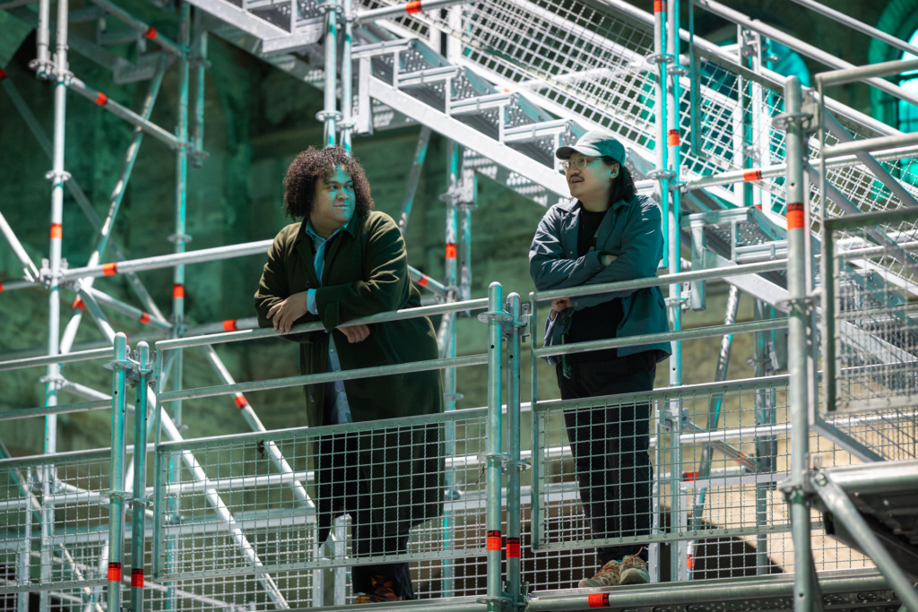 Au centre, un pont en échafaudage t’invite à grimper pour observer l’installation sous d’autres angles. Et ce n’est pas tout : tu pourras accrocher des rubans colorés sur cette structure, participant ainsi à la création collective d’un arc-en-ciel « in progress ». L’œuvre illustre parfaitement la démarche de l’artiste, qui traduit les phénomènes naturels et nos désirs en sculptures immersives.