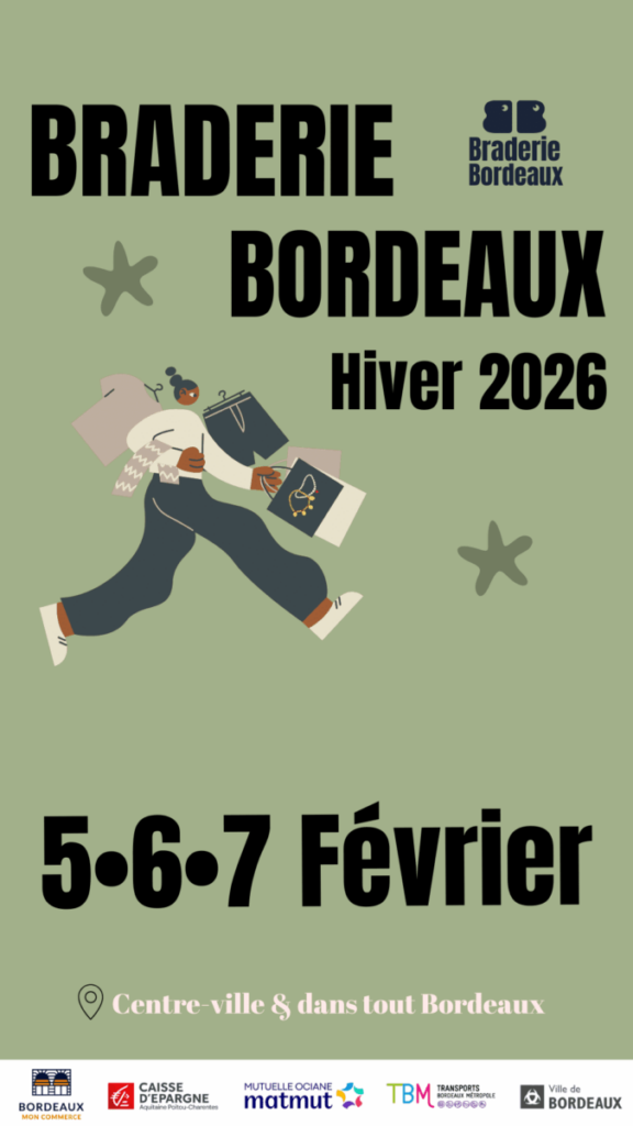 Que tu sois Bordelais ou simplement de passage, ne manque pas ce rendez-vous incontournable : trois jours pour flâner, chiner et profiter de l’énergie du centre-ville. Note bien les dates et les horaires : du jeudi 5 au samedi 7 février 2026, de 9 h à 19 h. Mets tes chaussures confortables, ouvre l’œil et laisse-toi tenter par les bonnes affaires de la Braderie d’hiver !